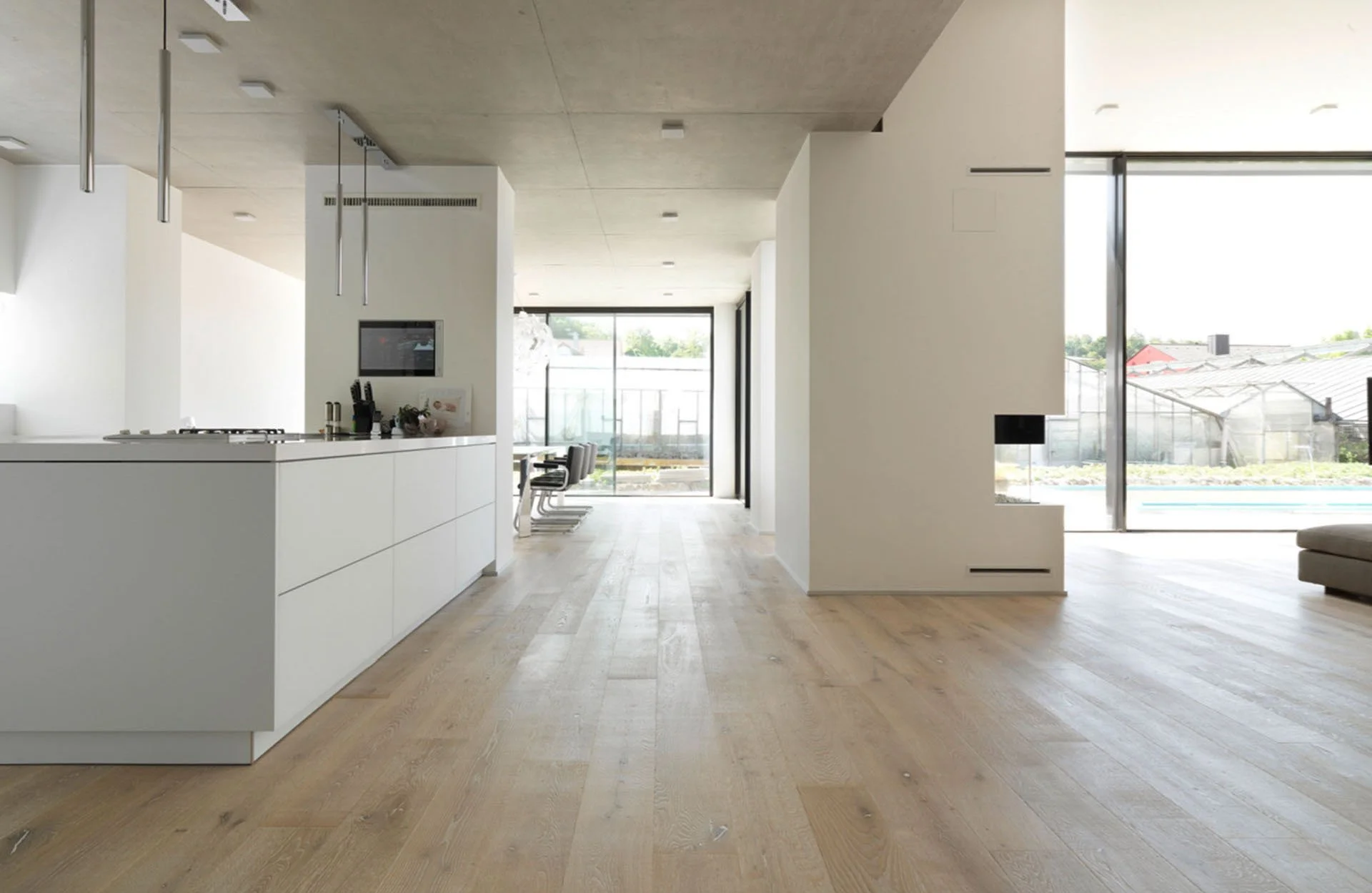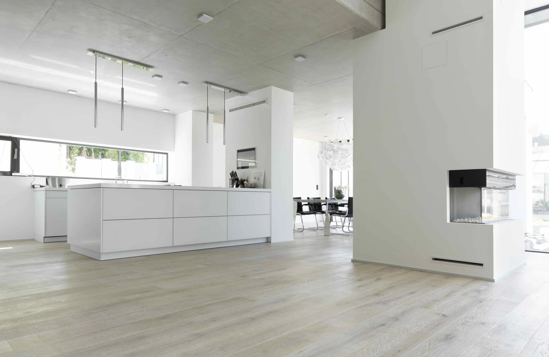 Puristische Materialien wie sichtbarer Beton, schwarzer Granit und Glas korrespondieren mit den natürlichen Materialien des Eichenparketts. Großzügige Raumhöhen bis zu 3,6m Höhe, flächenbündig in die Betonwände eingebaute massive Eichentüren sorgen für spannende Innenansichten.