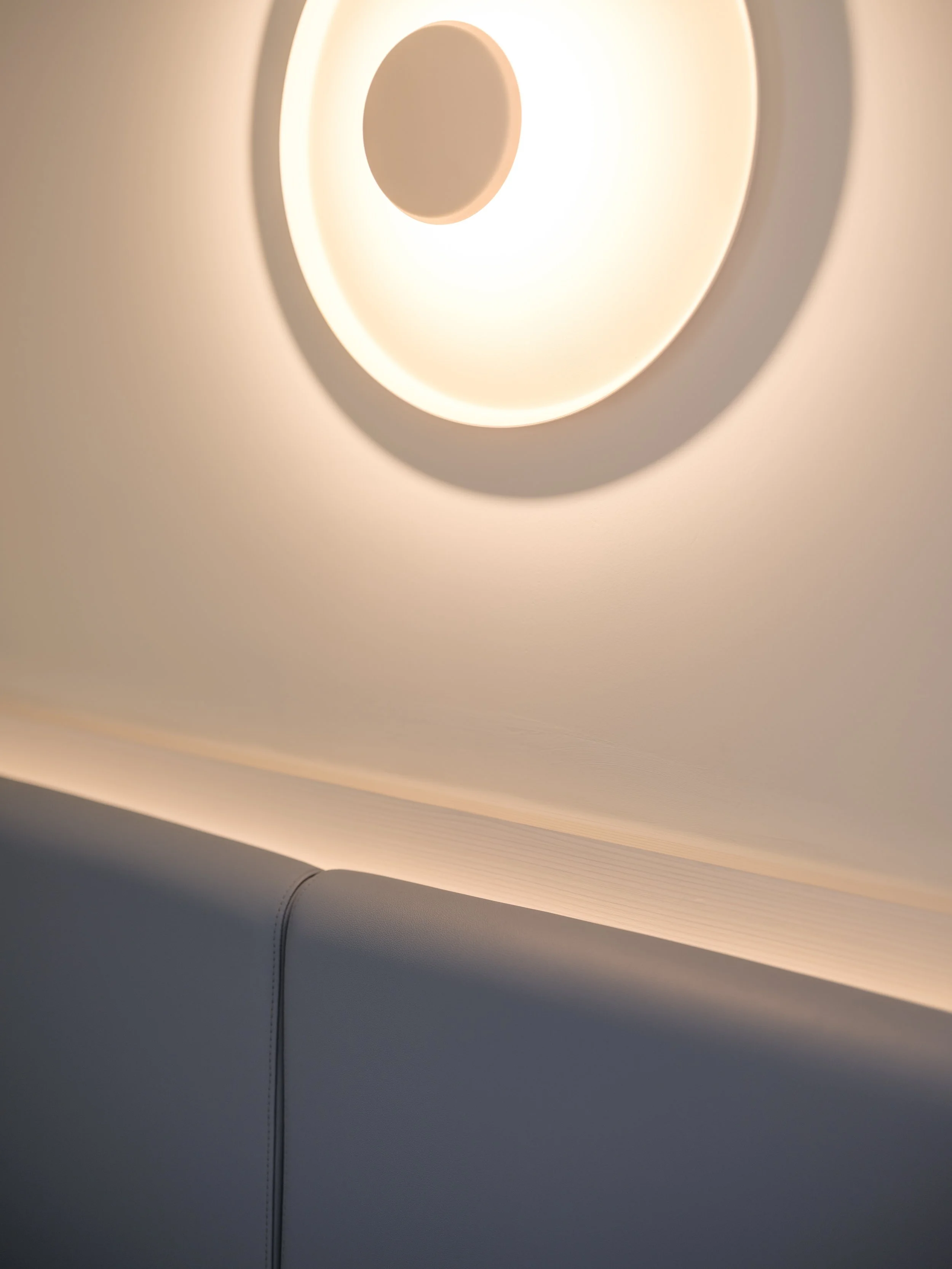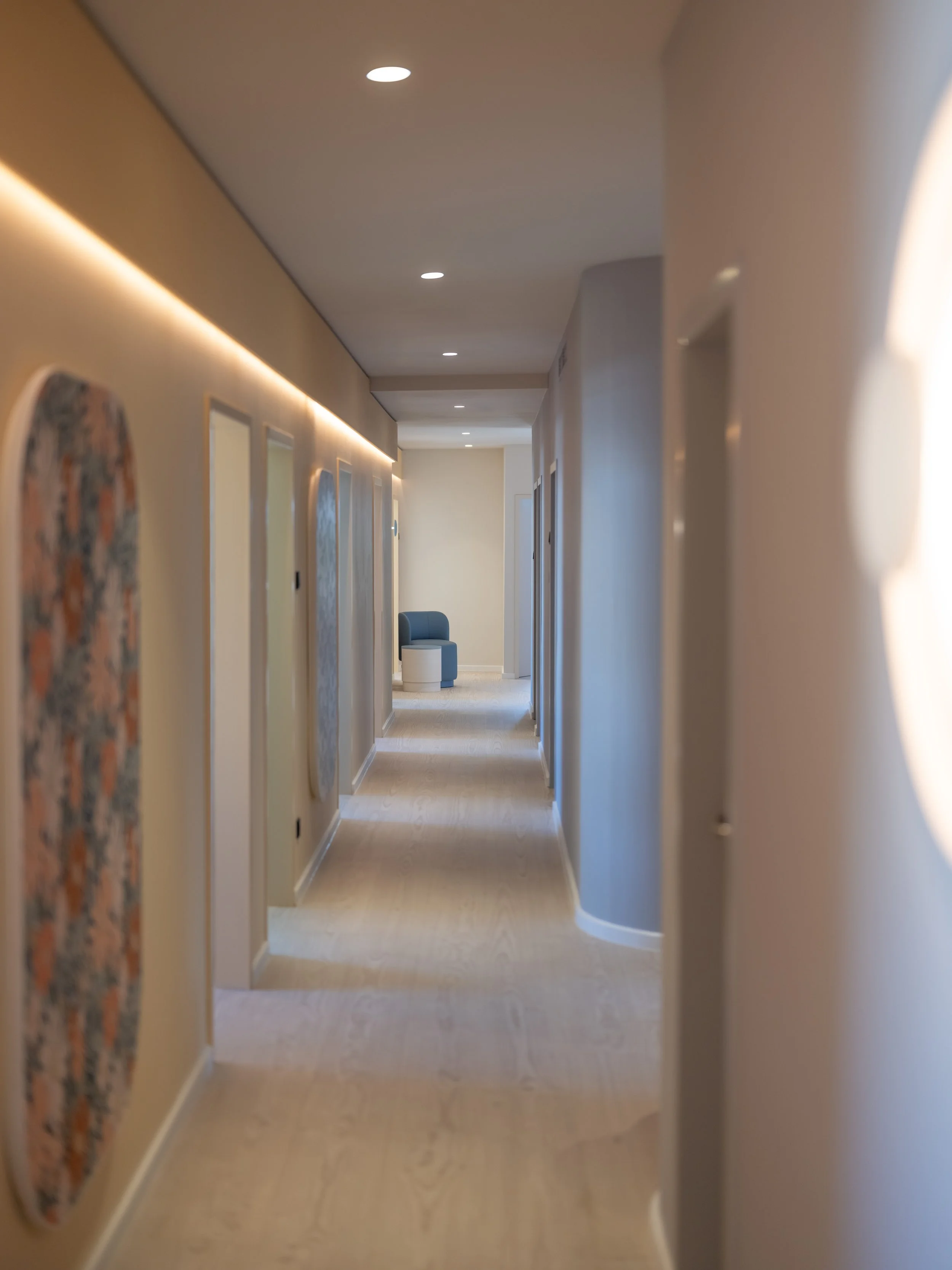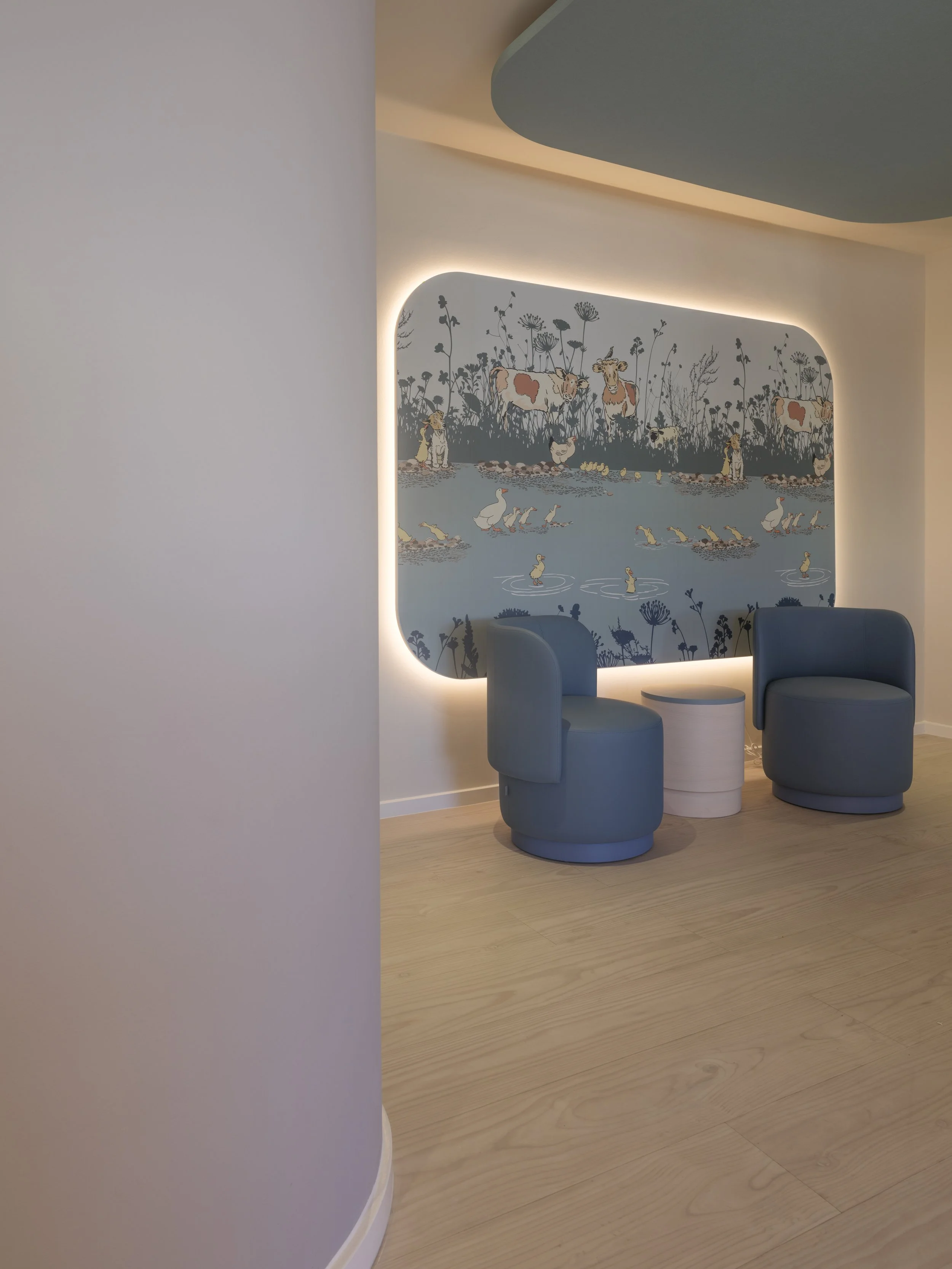 Ein harmonisches Konzept aus sanften Pastelltönen, natürlichen Materialien und runden Formen schafft eine freundliche, einladende Atmosphäre. Kindgerechte Tapeten und wohnliches Licht nehmen den Räumen die sterile Strenge klassischer Praxen und vermitteln Geborgenheit.